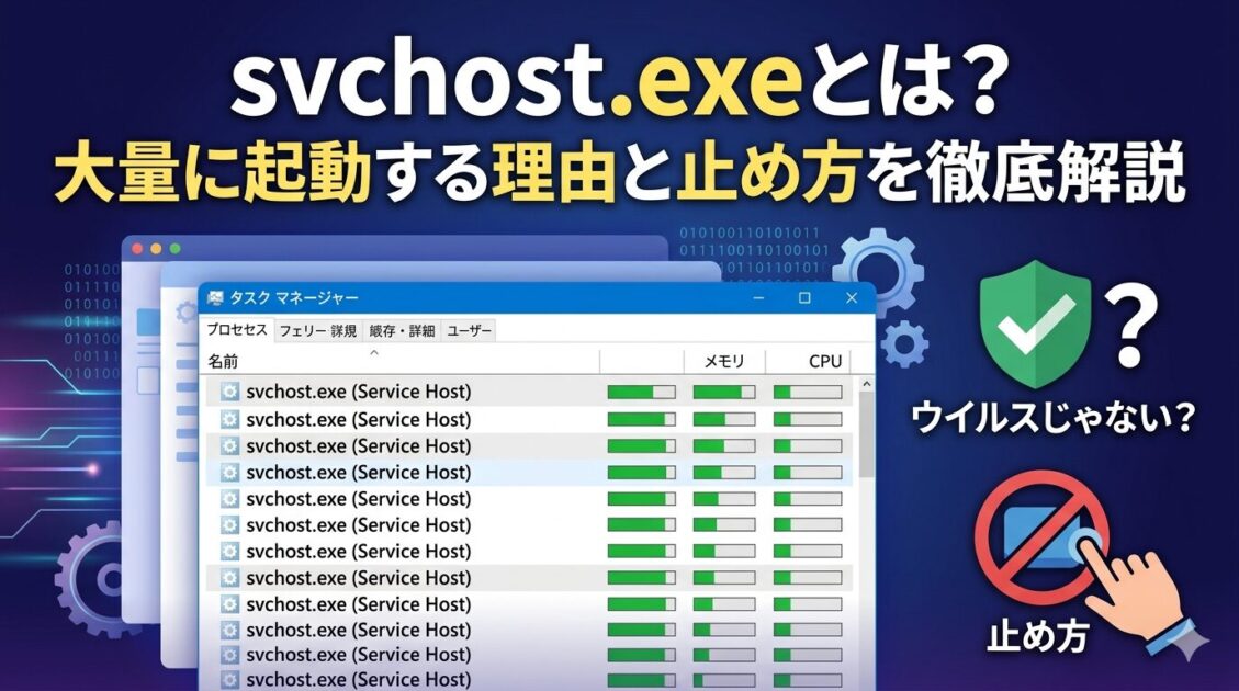 タスクマネージャーを開いたとき、「svchost.exe」が大量に表示されていて驚いた方は多いはずです。しかも CPU やメモリをそれなりに使っていると、「ウイルス感染では?」と不安になりますよね。